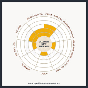 DESCRIPCIÓN: Levadura de Ale seleccionada específicamente por su habilidad de producir un perfil único tendiendo a los ésteres frutales deseados en estilos de la costa este y NEIPA. Una fermentación regular va a producir ésteres tropicales, duraznos y drupas. Esta cepa promueve la biotransformación durante la fermentación por lo que acentúa los sabores y aroma a lúpulo.